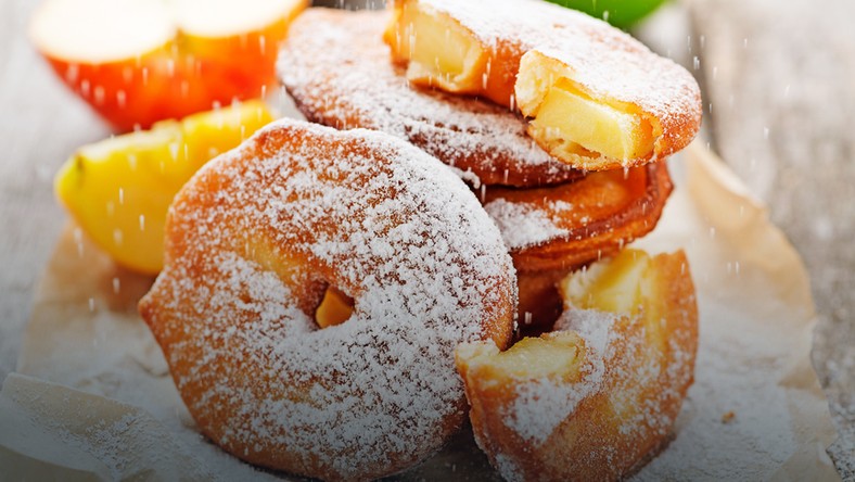- Jabłka maczać w cieście i kłaść na rozgrzany tłuszcz. Usmażyć z dwóch stron na złoto. Posypać cukrem pudrem.